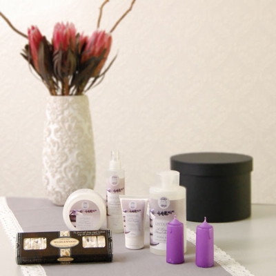 A gorgeous hatbox filled with lavender fragranced products including a creme bath,body and hand lotion, body scrub, room and linen mist and two candles to help set the mood for relaxation. All beautifully packaged.