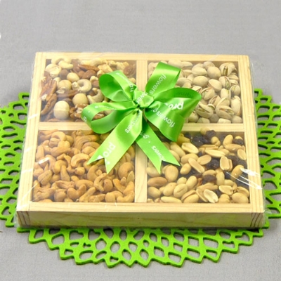 A yummy treat for any nut fanatic. This wooden box is filled with 200g mixed nuts, 200g Peri Peri cashews, 200g peanut & raisins and 150g pistachios.