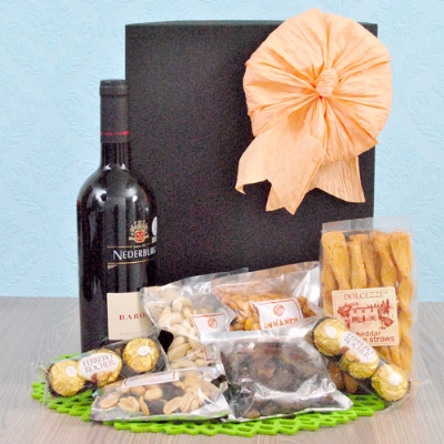 A bottle of red wine, cheese straws, cashew nuts, spiced corn, peanuts & raisin mix, biltong and Ferrero Rocher chocolates presented in a beautiful black gift box.